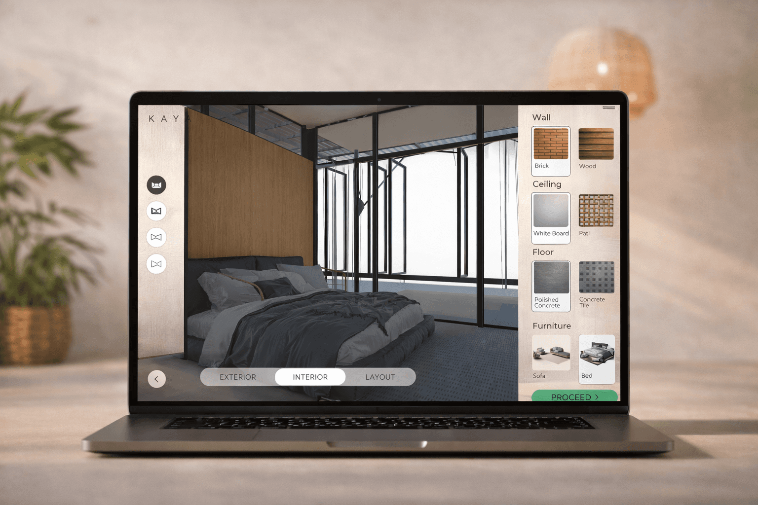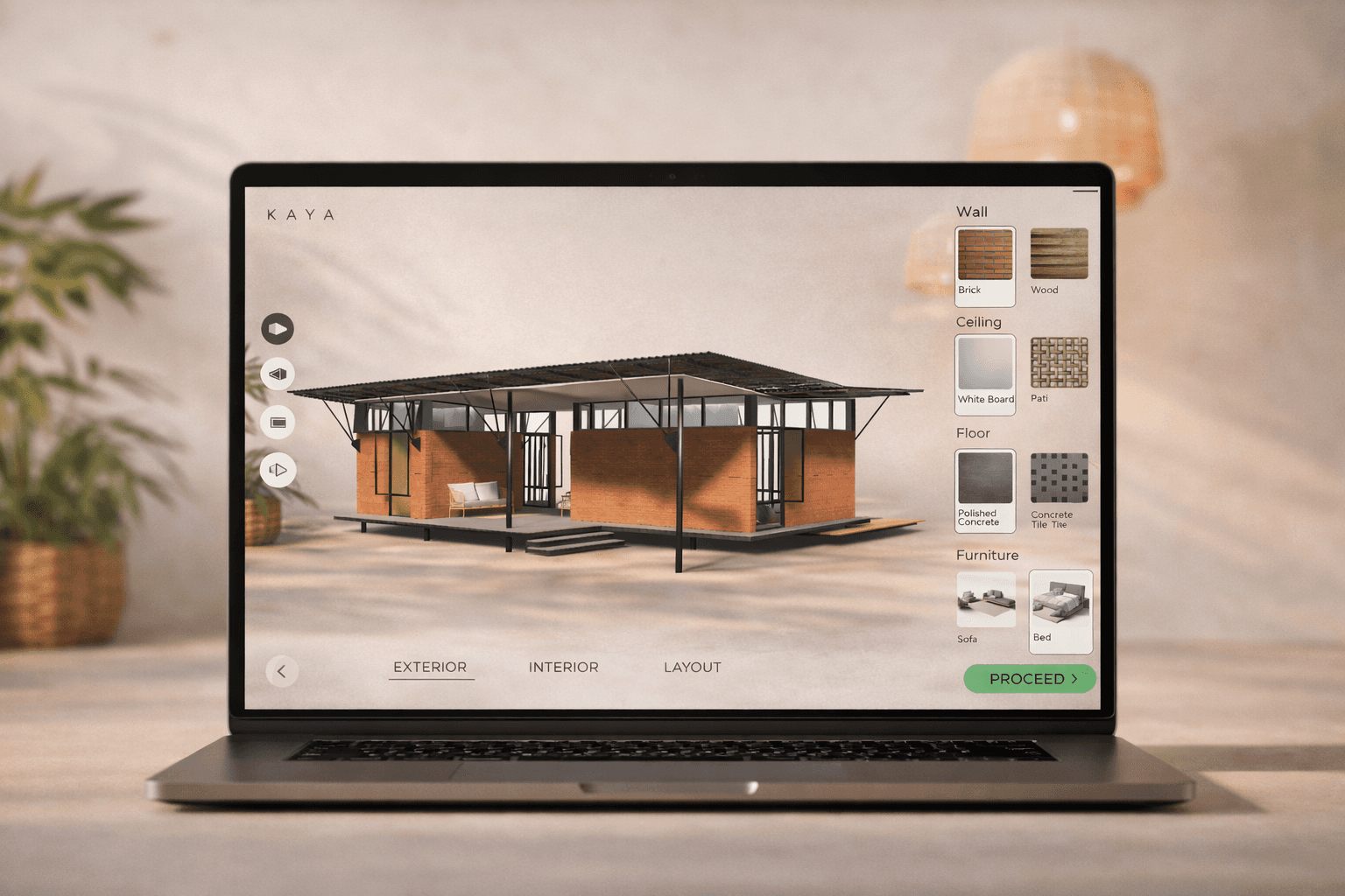 Kayaa Studio is a browser-based 3D property visualization tool that lets potential buyers explore real estate properties in full 3D space — and customize them in real time. Users can walk through rooms, swap materials on floors, walls, countertops, and fixtures, and see exactly how their choices look before committing. Once satisfied, they submit their customized configuration directly to the property owner to request a quote — turning passive property browsing into an interactive buying experience. Built with Unity and C#, deployed on the web via WebGL with zero downloads required.